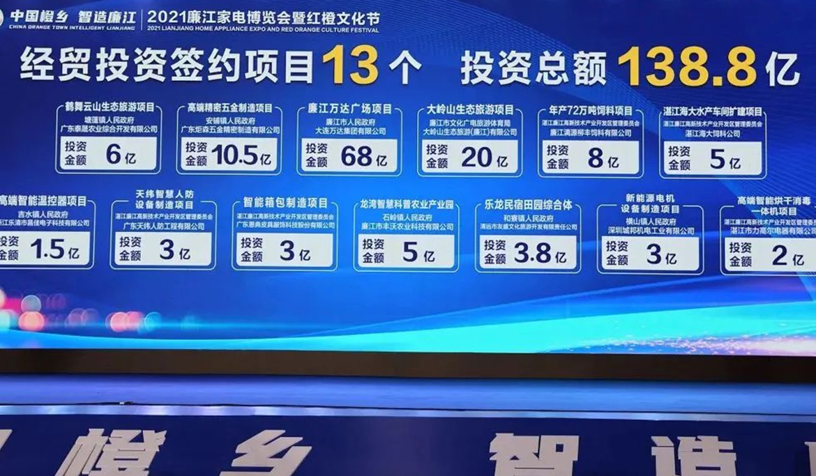 12月30日上午,以“中國(guó)橙鄉(xiāng)、智造廉江”為主題的2021廉江家電博覽會(huì)暨紅橙文化節(jié)以線上直播形式開幕。當(dāng)天發(fā)布廉江電飯鍋、電水壺團(tuán)體標(biāo)準(zhǔn)和“廉江家電”小程序,宣布成立廉江家電質(zhì)量聯(lián)盟,頒發(fā)廉江家電優(yōu)品證書,舉行廉江“十大創(chuàng)意家電產(chǎn)品”授牌儀式,簽約項(xiàng)目25個(gè),合同投資總額143.8億元。