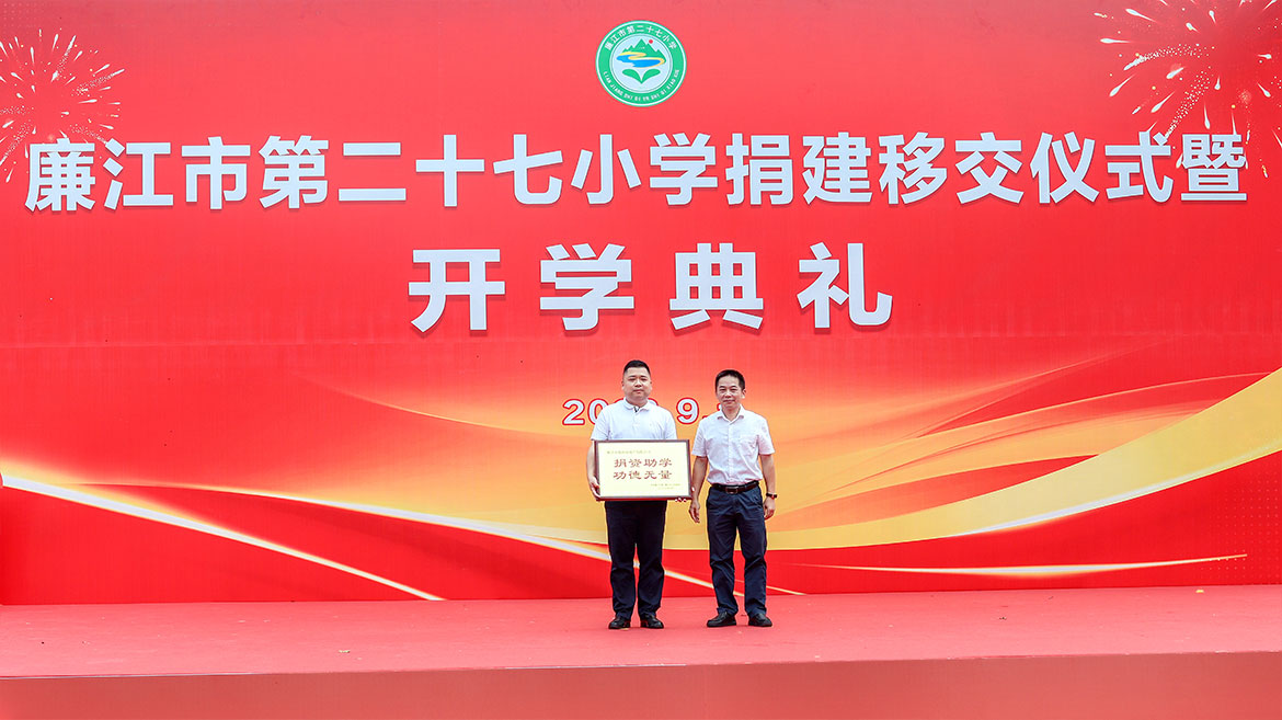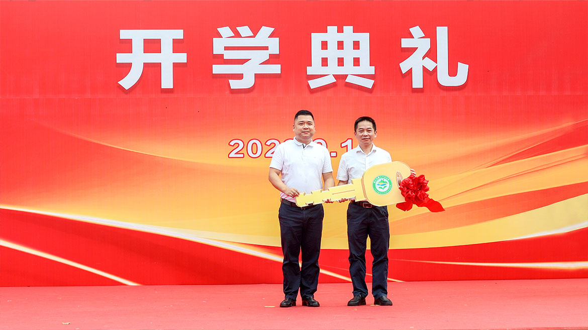 儀式上,柯俊接過象征放飛夢(mèng)想與開啟希望的金鑰匙,并代表廉江市委、市政府,將刻有“捐資助學(xué) 功德無量”字樣的牌匾授予龍湖山莊。