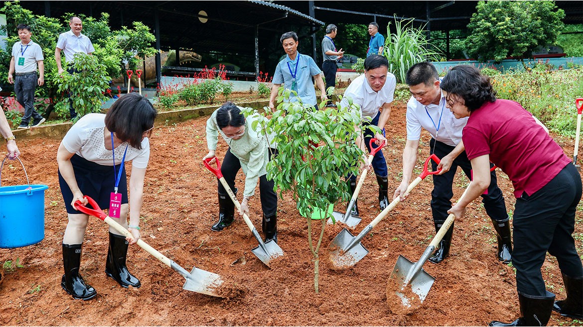 推介大會結(jié)束后,與會領(lǐng)導(dǎo)參加“綠美廣東”新品荔枝種植活動,種植早熟荔枝新品種“仙桃荔”,并參觀野生荔枝林,體驗(yàn)廉江荔枝文化,還實(shí)地了解荔枝林下的湛江雞養(yǎng)殖情況。省農(nóng)業(yè)農(nóng)村廳領(lǐng)導(dǎo)、湛江市領(lǐng)導(dǎo)、湛江市直單位領(lǐng)導(dǎo)和廉江市領(lǐng)導(dǎo)參與“綠美廣東”新品荔枝種植活動。