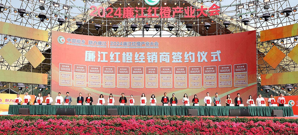 活動現(xiàn)場,舉行了廉江紅橙開采儀式、廉江紅橙出口發(fā)車儀式、廉江紅橙采購簽約儀式。本次紅橙經(jīng)銷商簽約共13個項(xiàng)目,簽約總金額約2.76億元。隨后還舉行了《橙色年華》電影首發(fā)儀式、“中國橙鄉(xiāng)·灣區(qū)共享”文旅活動啟動儀式。